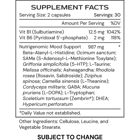 Promotes a sense of calm and reduces anxiety by managing healthy cortisol levels and supporting the HPA axis through the regulation of stress-reducing genes TPH2, SLC6A4, GABRA1, COMT, and others.