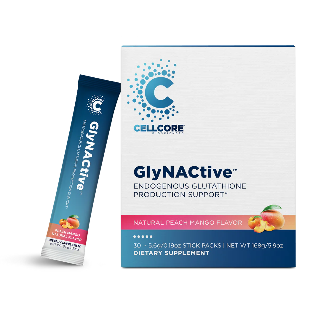 1 Pack CellCore GlyNACtive: 60 day supply. (Take every other day). Innovative Glutathione Production Support* GlyNACtive™ combines NAC, glycine, selenium, and other cofactors to optimize glutathione levels, reduce oxidative stress, and support detoxification. It enhances mitochondrial health, balances energy production, and fortifies antioxidant defenses. With its bioavailable ingredients, GlyNACtive™ promotes whole-body recovery, resilience, and vitality.