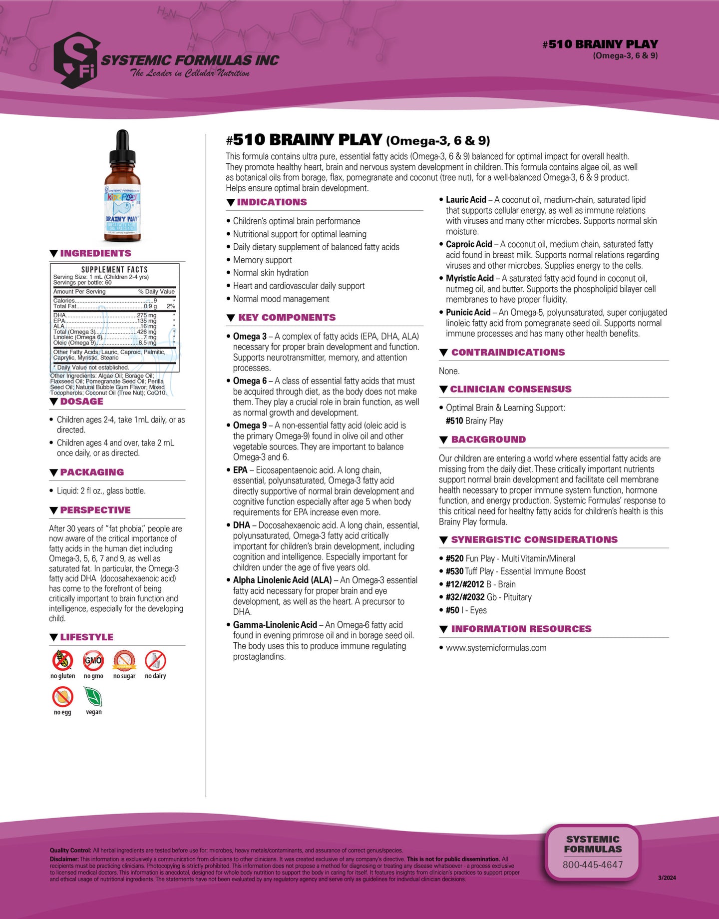 This formula contains ultra pure, essential fatty acids (Omega 3, 6 & 9) balanced for optimal impact for overall health. This formula contains odorless fish oil as well as botanical oils from borage, flax, pomegranate and coconut for a well-balanced Omega 3, 6 & 9 product. These ingredients are known to support healthy heart, brain and nervous system development in children.