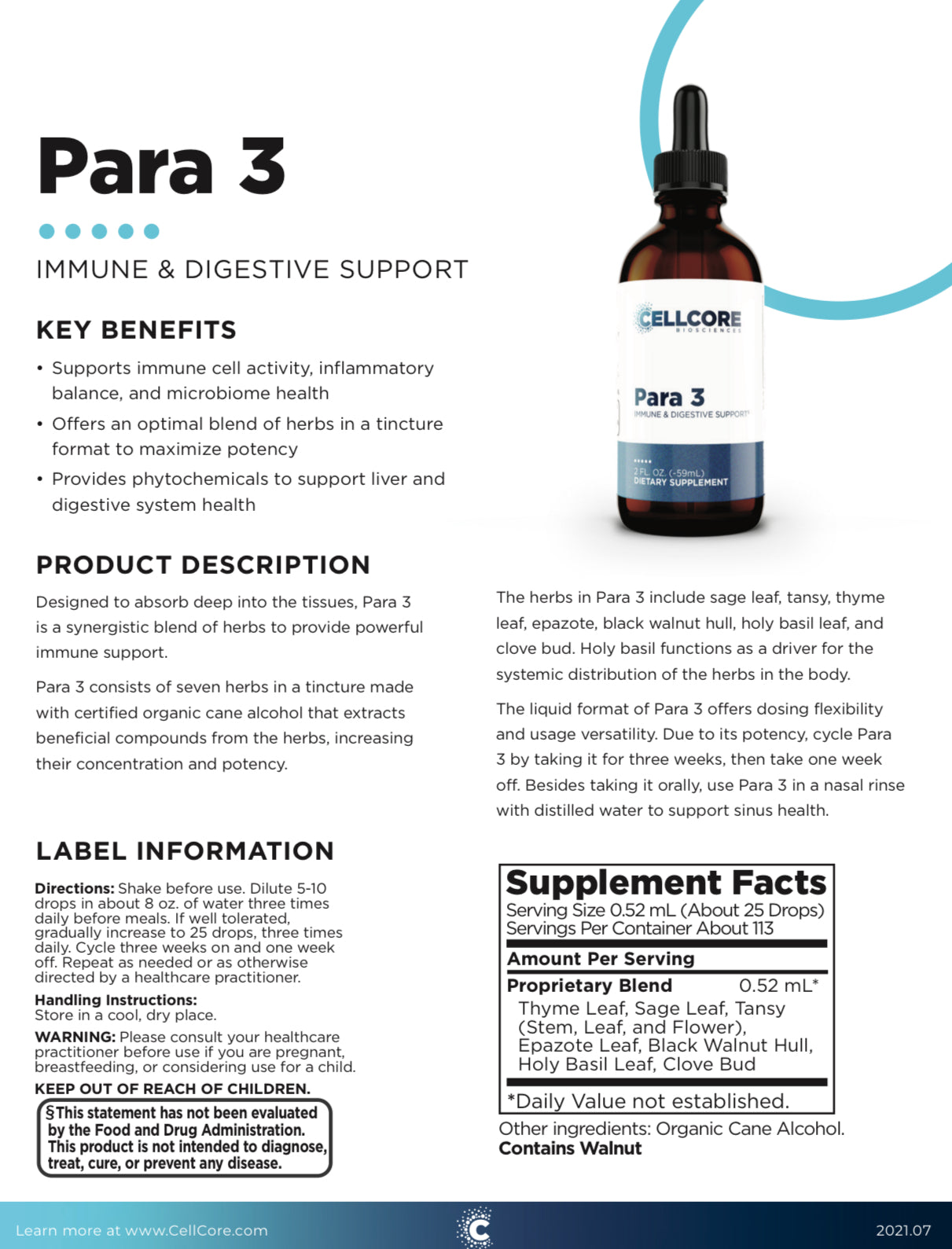 Para 3 is a liquid tincture with seven herbs, including black walnut hulls, epazote, tansy, holy basil, and clove bud, to support detoxification and immunity.* As a highly concentrated tincture, it’s recommended to take Para 3 after you’ve already worked your way through the first two steps of the Foundational Protocol. This will promote healthy functioning drainage pathways, and will help minimize unwanted reactions or symptoms.*